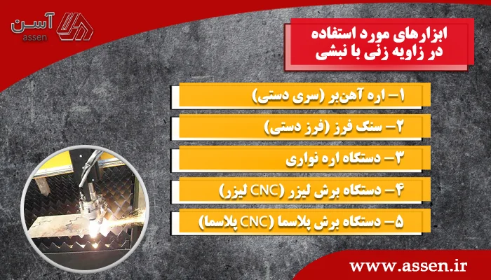 ابزارهای مختلفی برای زاویه زنی با نبشی وجود دارند، از جمله اره آهنبر دستی، سنگ فرز، اره نواری، دستگاههای CNC پلاسما و لیزر. انتخاب ابزار بستگی به دقت مورد نیاز، ضخامت نبشی و حجم کار دارد.
