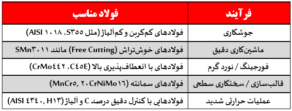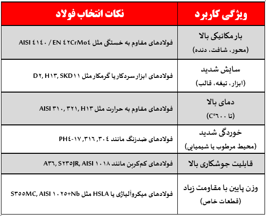 کاربرد آن قطعه فولادی اهمیت زیادی دارد چون سایر عوامل مثل میزان دسترسی و خواص مکانیکی هم به کاربرد آن وابستهاند.